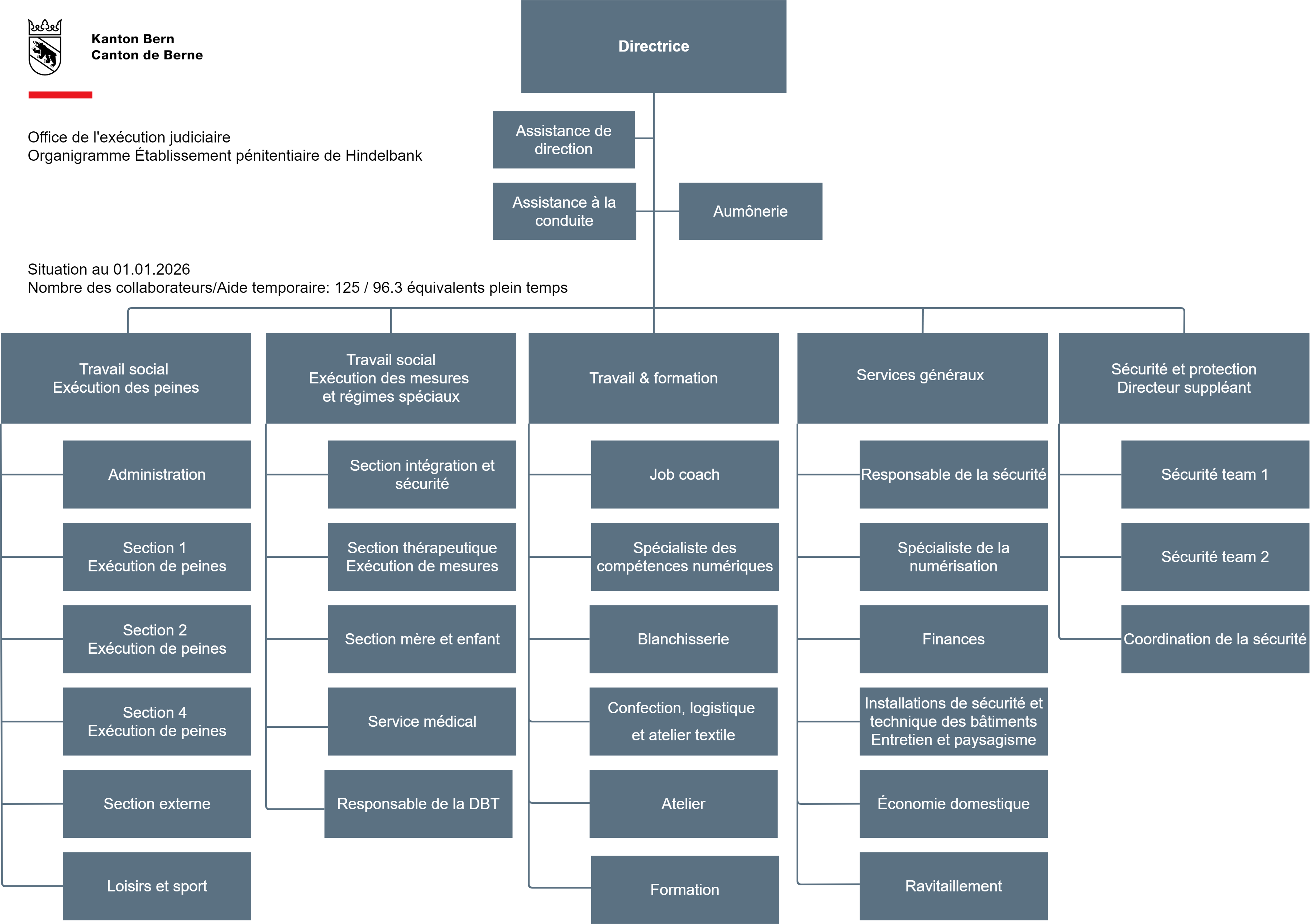 L'EP Hindelbank peut compter sur la collaboration de 100 personnes représentant quelque 90,1 postes à plein temps. L'organisation est subdivisée en cinq domaines: Exécution des peines, Exécution des mesures, Travail et formation, Services centraux et Sécurité. Les responsables de domaine sont subordonnés à la directrice.